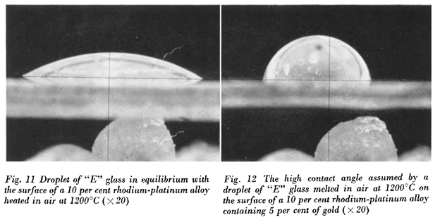 An alloying addition of gold to the platinum base leads to a significant increase in the contact angle of molten glass on the surface of the metal. In the range 1,100-1,400°C the contact angle of a typical borosilicate glass on pure platinum is, depending on the temperature, between about 14° and 40°.