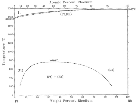 The phase diagram of the platinum-rhodium alloy system shows a continuous solid solution with no tendency to phase separation above approx. 760°C. Because of the relatively low temperature of the phase separation, it does not normally arise under practical conditions.