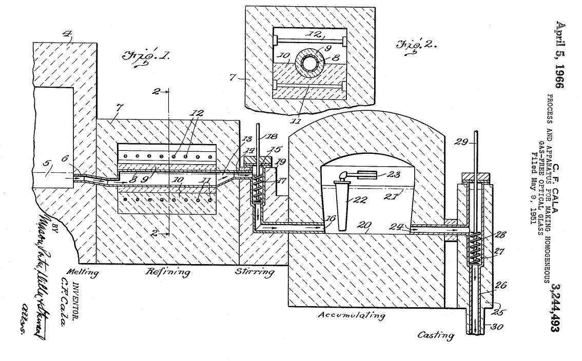 如同先前所述,以陶瓷容器很難生產出令人滿意的光學玻璃。以鋇冕玻璃為例,無論溫度如何,生產出的鋇冕玻璃總是含有大量的氣泡及細紋。熔融的光學玻璃在24小時內將陶瓷容器侵蝕掉1%至2%是很正常的。