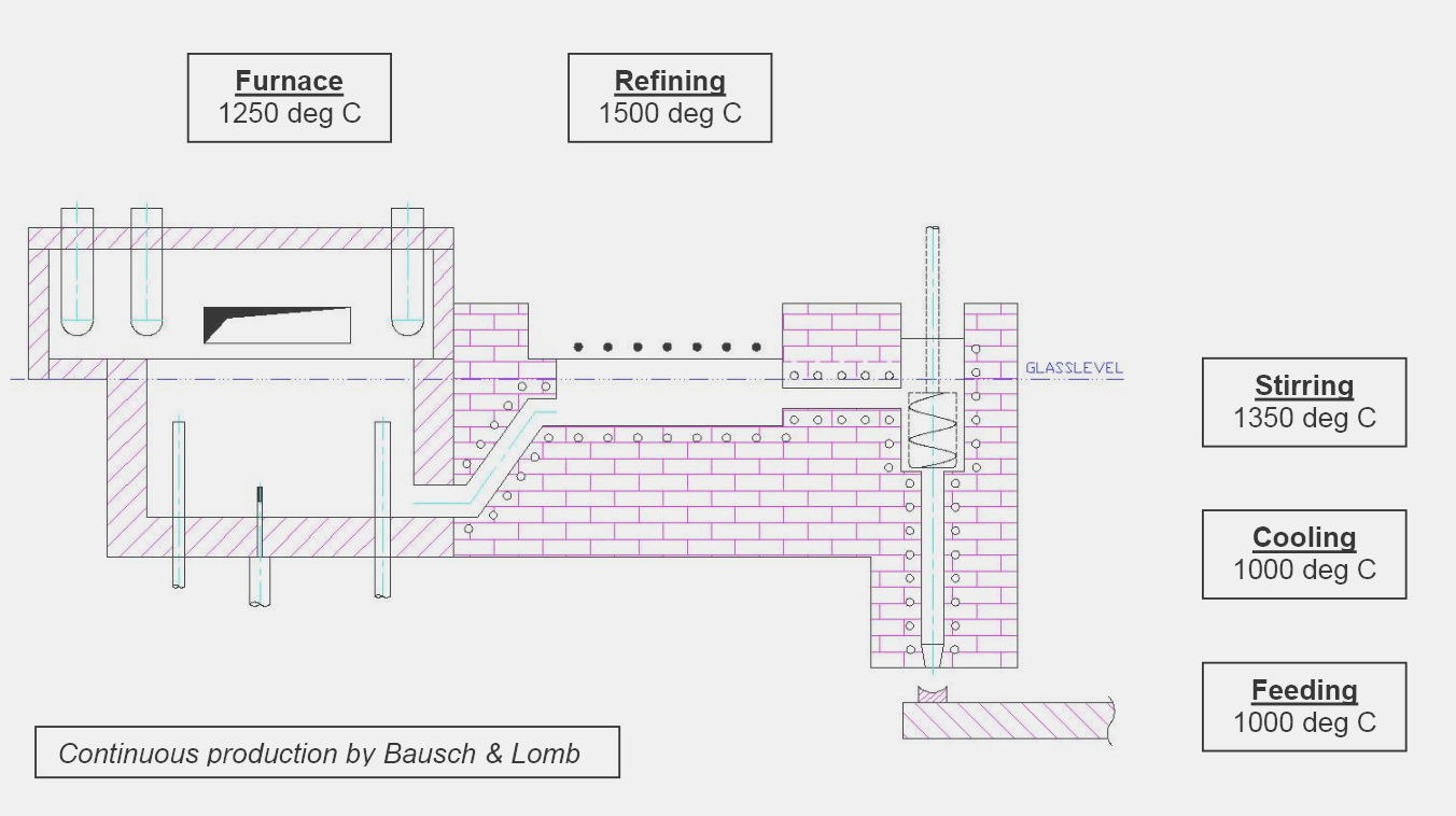 Bausch & Lamb 的窯爐使用混合燃料加熱系統(結合天然氣及電力),玻璃本身則作為電阻。
