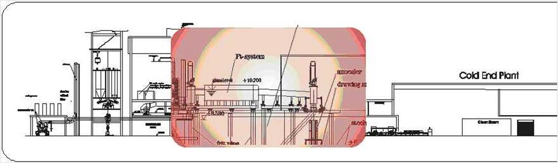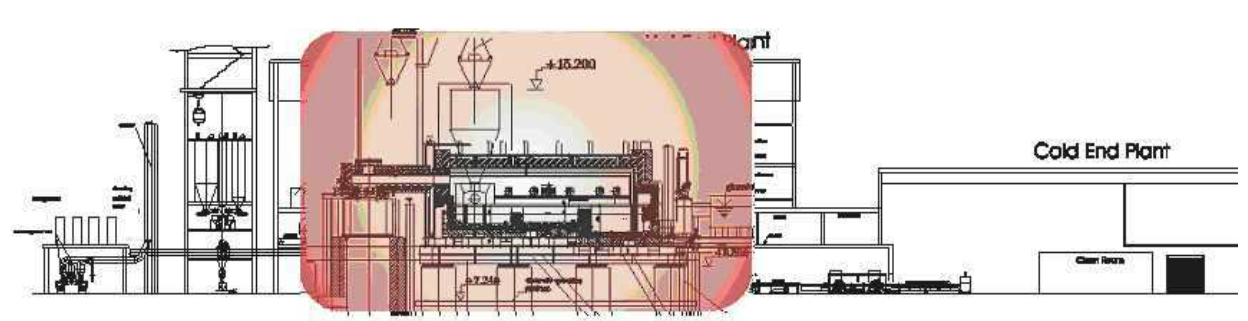 In the Muffle and Trough area the molten glass will flow on both sides of the trough into the Annealer where it meets temperatures of about 700 °C . After the annealing of the glass film took place it will leave the area with approx. 200~300 °C  in order to be cross cut in the BOD section.