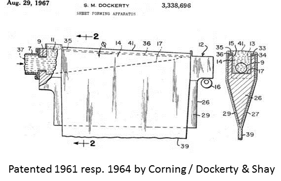 A method re-invented by Corning in 1961 by Dockerty and Shay and was patented in 1964. The first use of this method was to produce sunglass lenses. The fusion or overflow method is a variation of the slot down draw method but overcome the harmful effects of the slot.