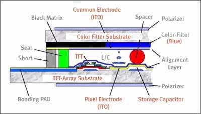 TFT Glass has as many TFTs as the number of pixels displayed, while a Color Filter Glass has color filter which generates color. Liquid crystals move according to the difference in voltage between the Color Filter Glass and the TFT Glass. The amount of light supplied by Back Light is determined by the amount of movement of the liquid crystals in such a way as to generate color.