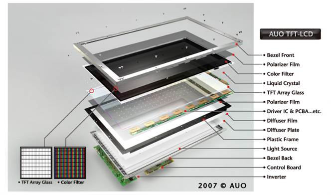 TFT LCD (Thin Film Transistor Liquid Crystal Display) has a sandwich-like structure with liquid crystal filled between two glass plates.