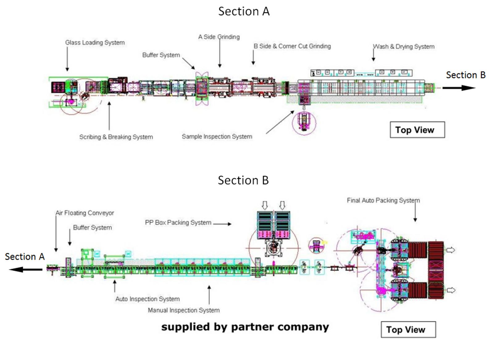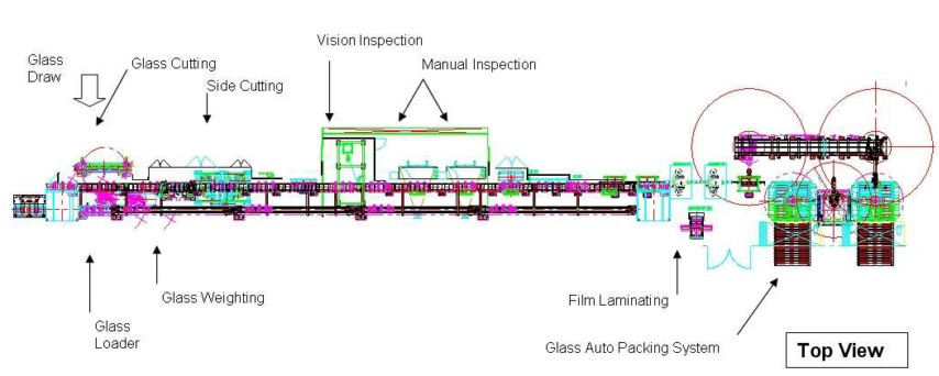 The glass flim will be cross cut and further processed in the BOD. After trimming of the edges of the glass sheet, a protective film will cover the glass sheet and it will be unloaded from the line for further processing in the cold end area.